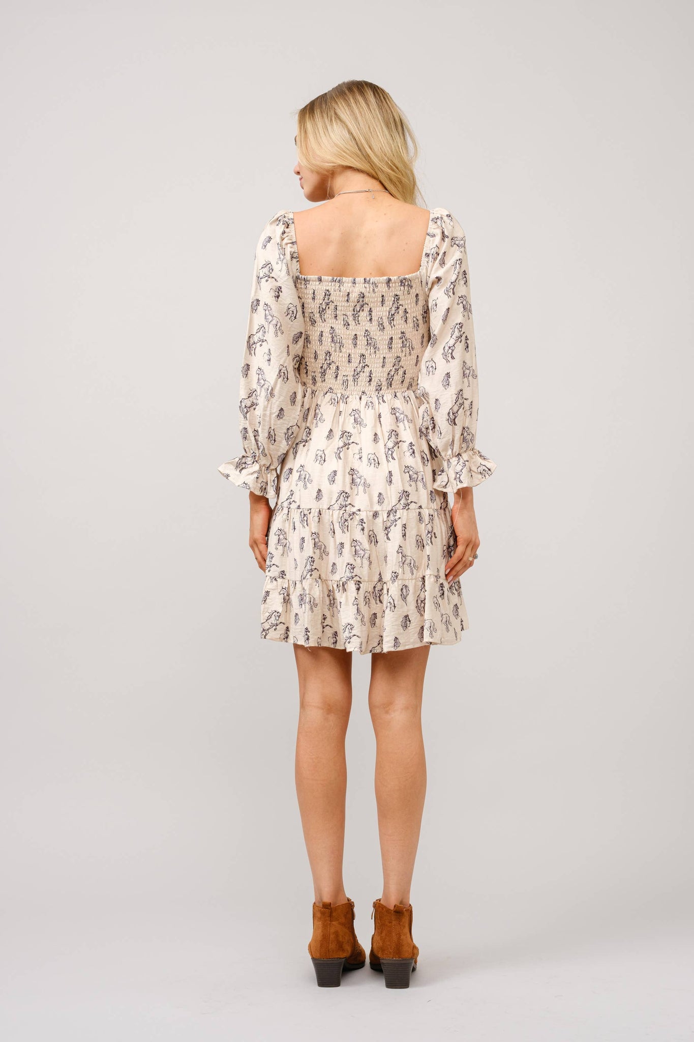 Smocked waist, puff sleeves, and a flowy tiered skirt for a charming look. 83% Rayon, 17% Nylon Model is 5'8" and wears a size Small