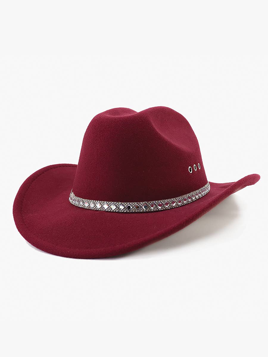 Item Details: Style: Cowboy hat -Band: Rhinestone band -Detailing: Eyelets Size: -One Size Add a bit of sparkle to your Western style this fall with the Baye Cowboy Hat—perfect for infusing your look with a touch of glamour.